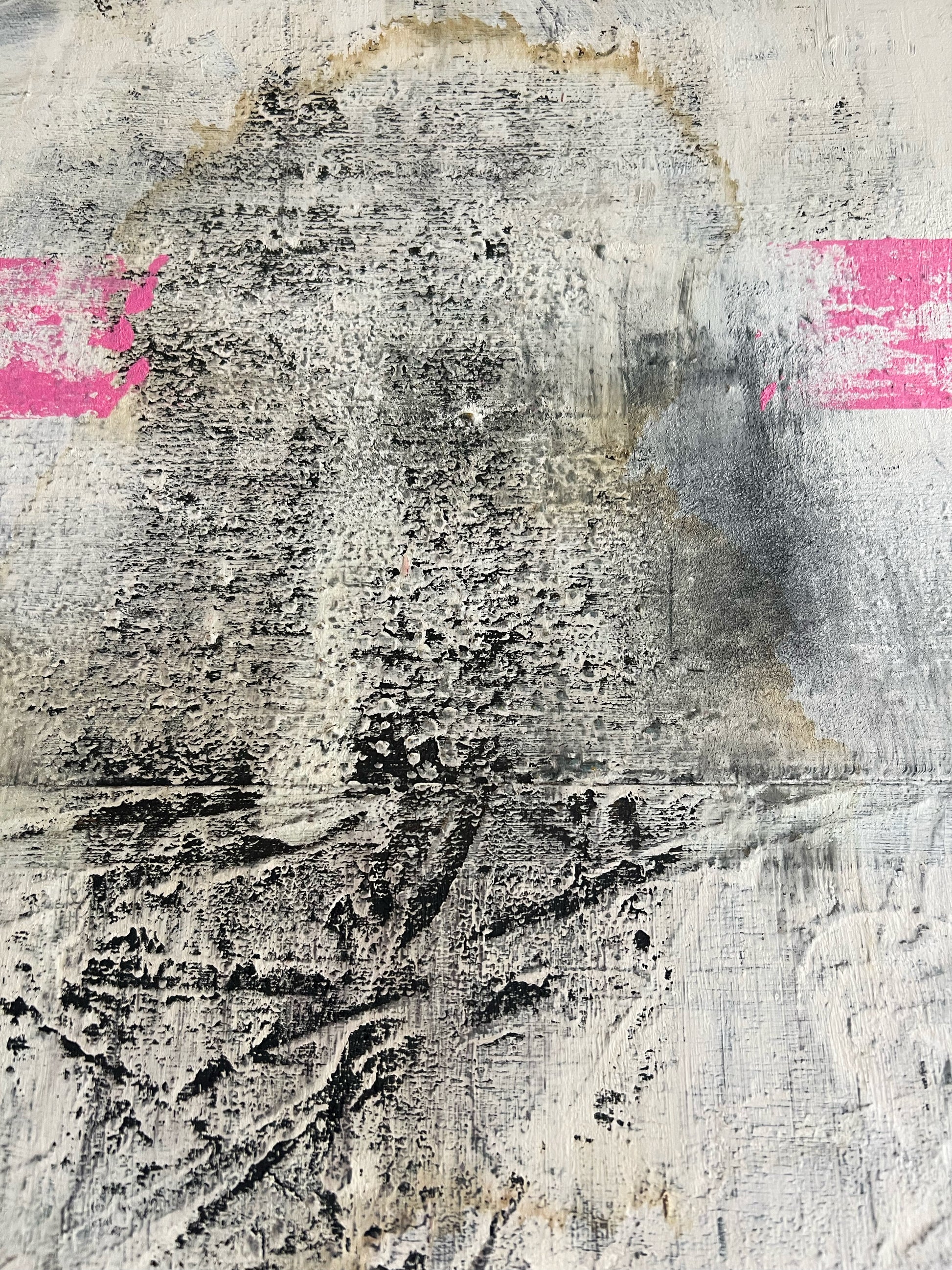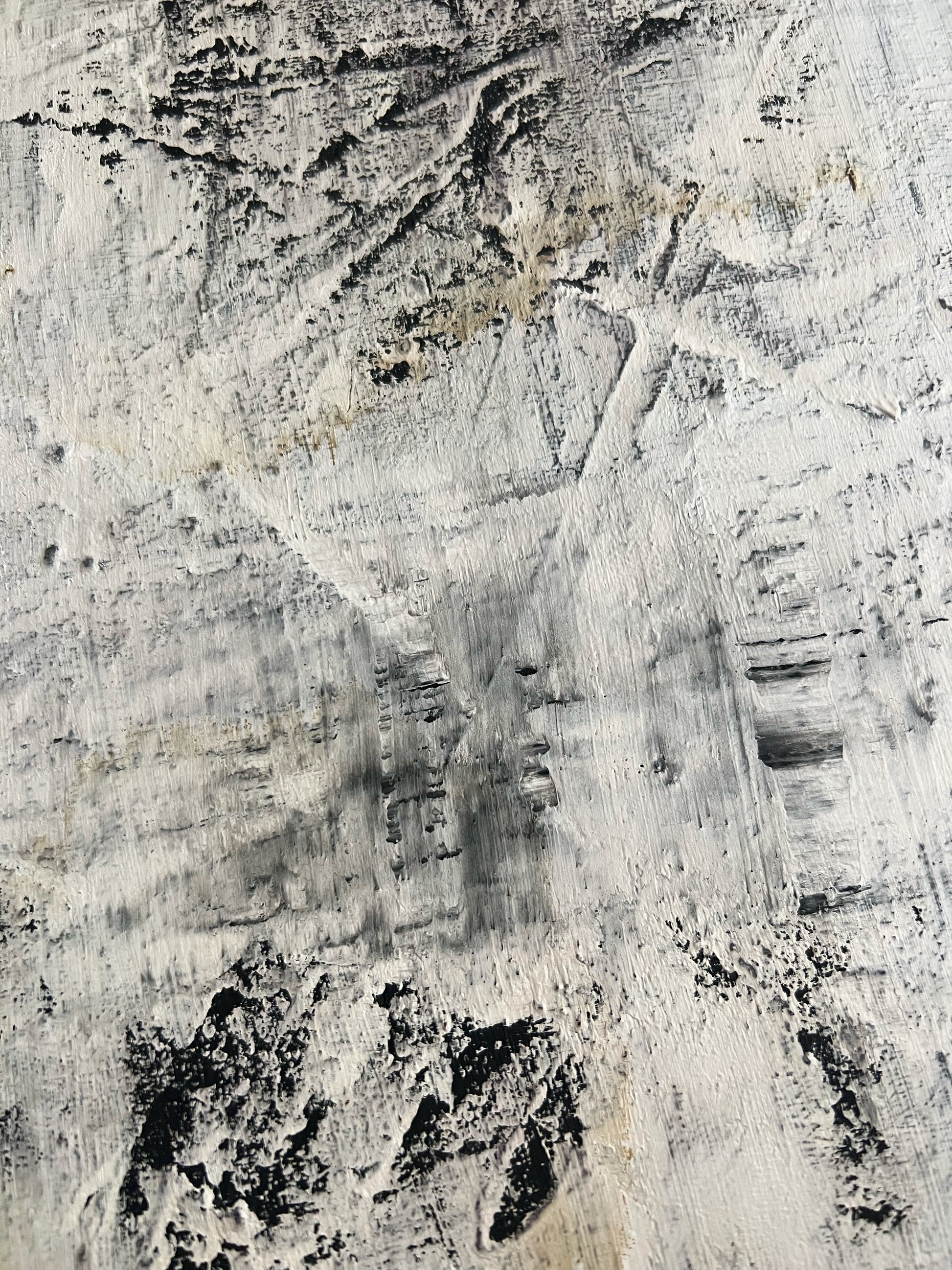 Aquestes obres úniques combinen tècniques de mitjans mixtos, amb textures creades a partir de gesso, serradures, acrílics i pigments barrejats a mà, resultant en superfícies estratificades que revelen la bellesa de la imperfecció i la transformació.