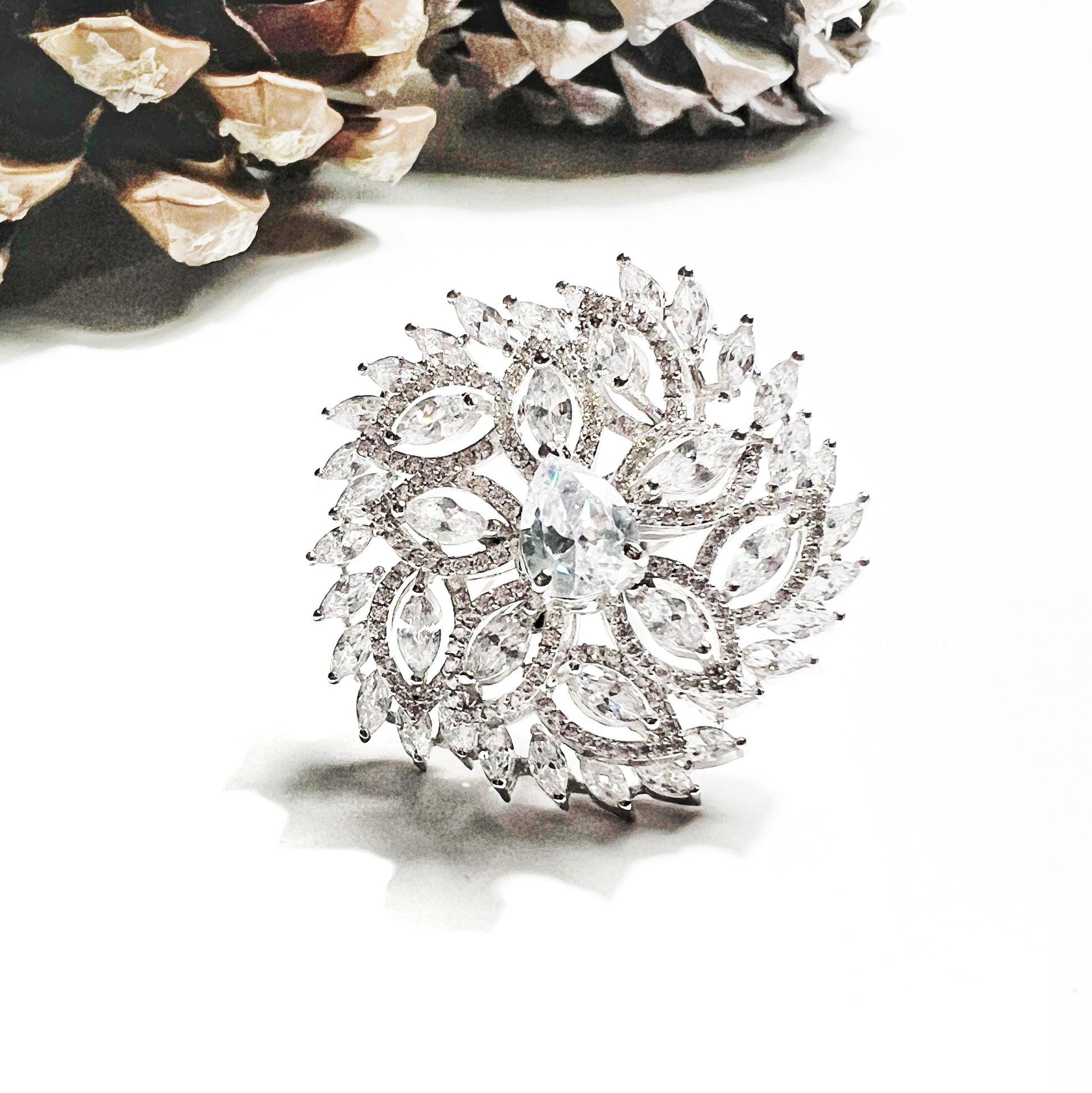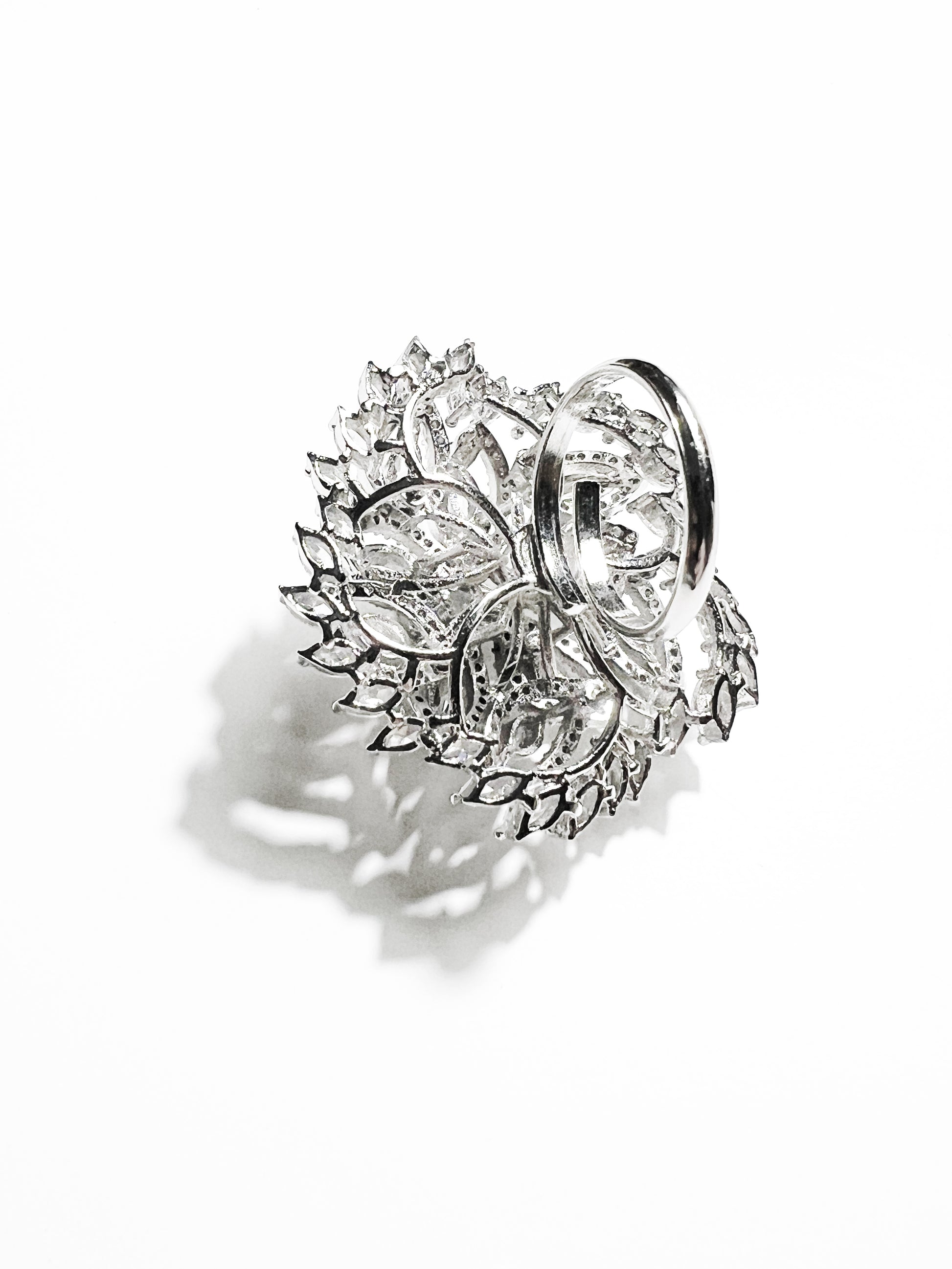 Inspirado en la alta joyería, este anillo redondo y audaz está elaborado con latón de alta calidad, bañado en oro blanco, y decorado con una piedra central de circonio rodeada de cristales de distintos cortes que brillan desde todos los ángulos.