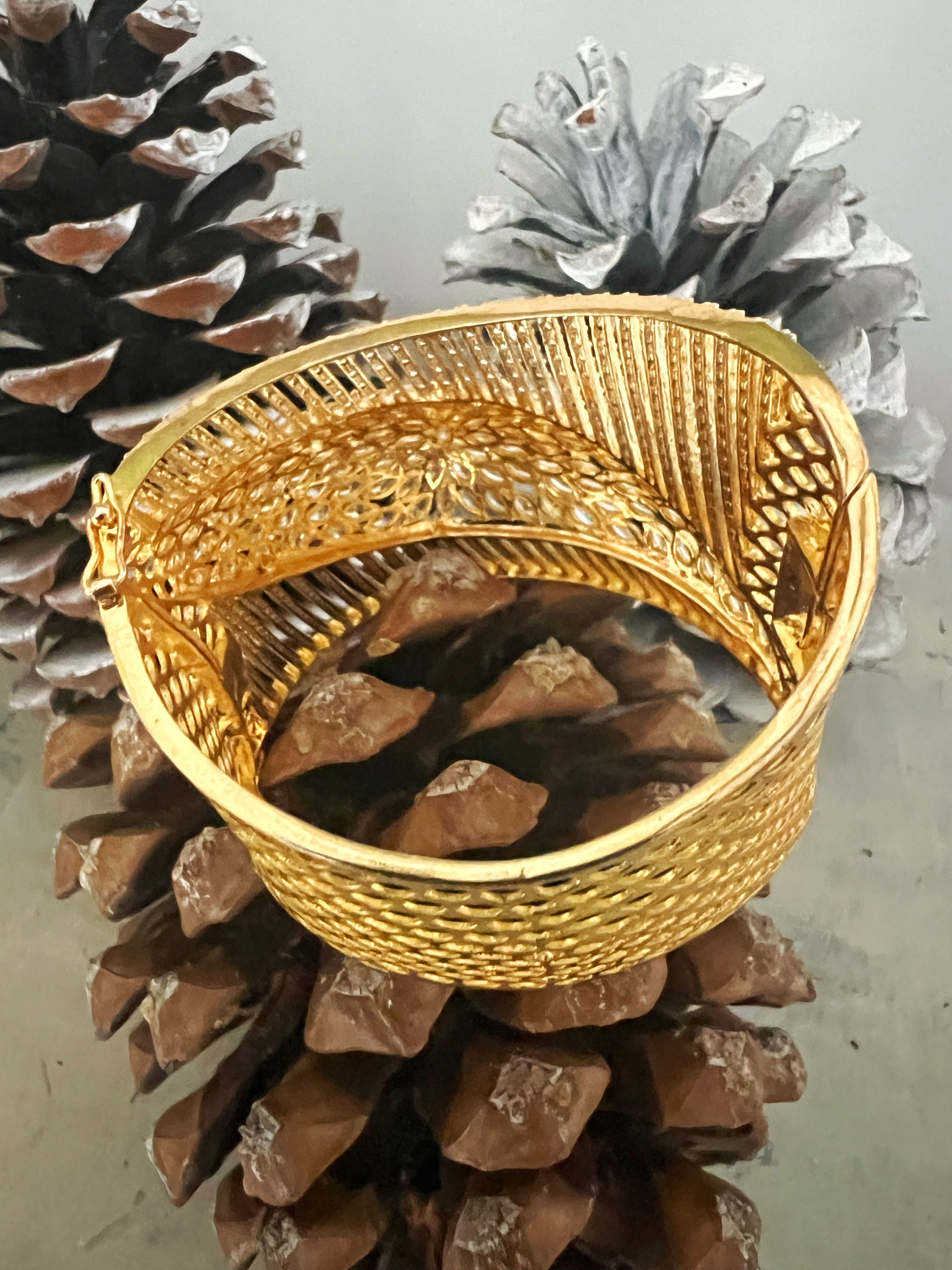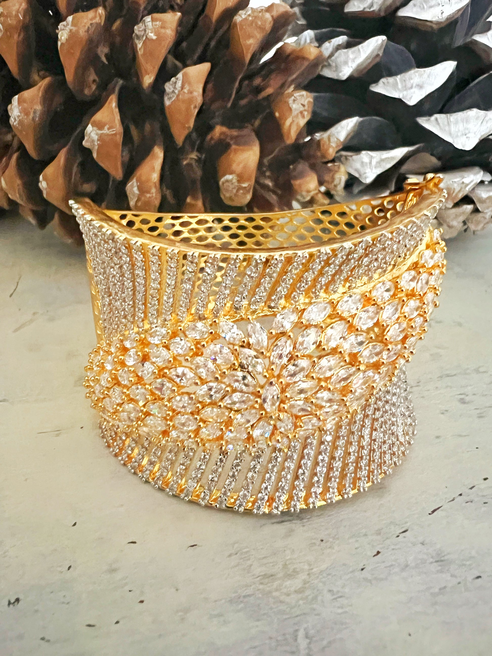 Audaz, escultórico y lleno de sofisticación, este brazalete rígido está elaborado en latón de alta calidad y decorado con brillantes Diamantes Americanos en la parte superior. Su forma arquitectónica lo convierte en una pieza llamativa, diseñada para mujeres que aprecian la joyería con presencia y elegancia.