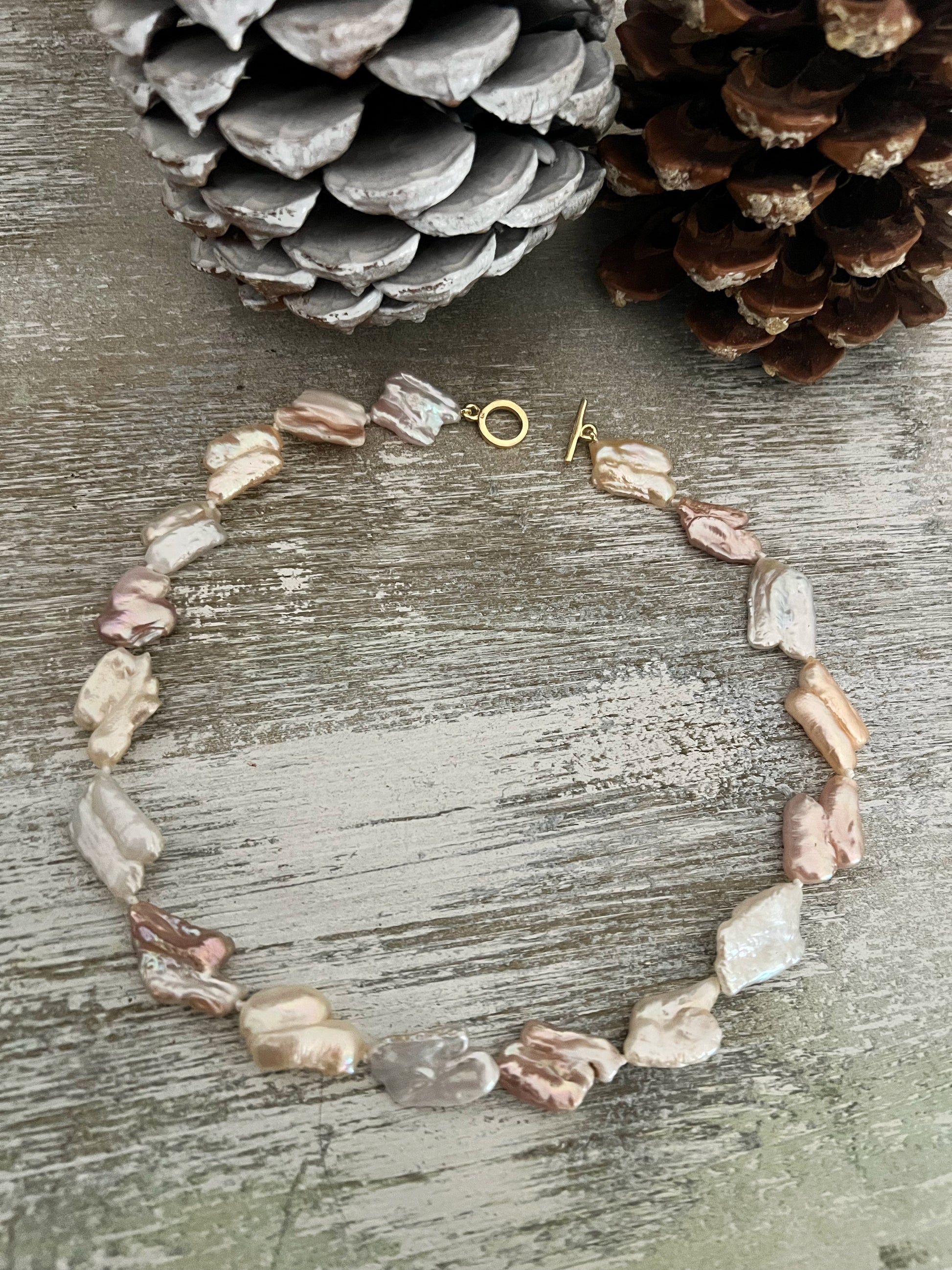 Una expresión de belleza orgánica y refinamiento atemporal. Esta gargantilla corta (43 cm) luce una encantadora hilera de perlas barrocas planas, de formas irregulares y orient multicolor — sutiles matices de blanco, dorado y rosa suave que reflejan una luz natural y envolvente.
