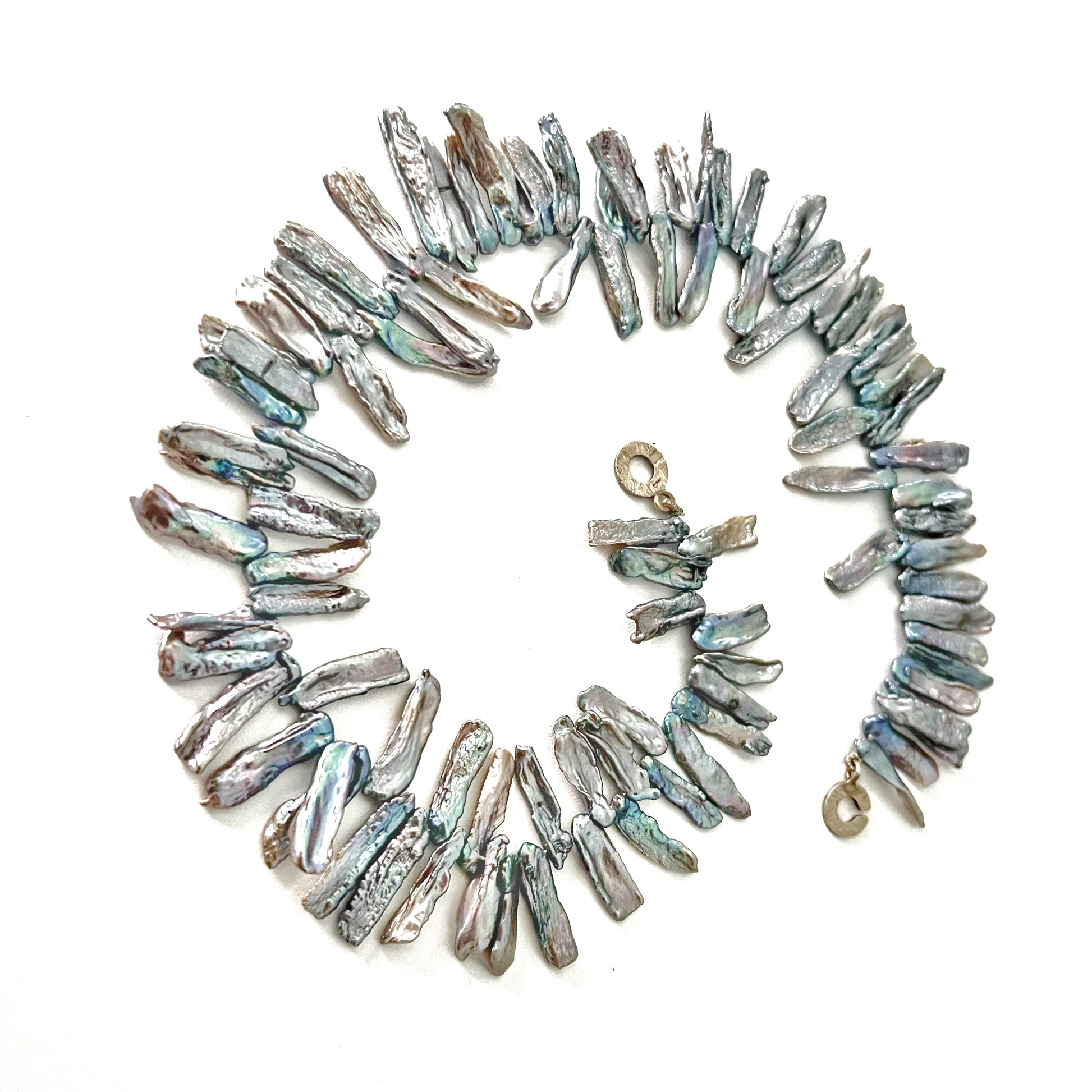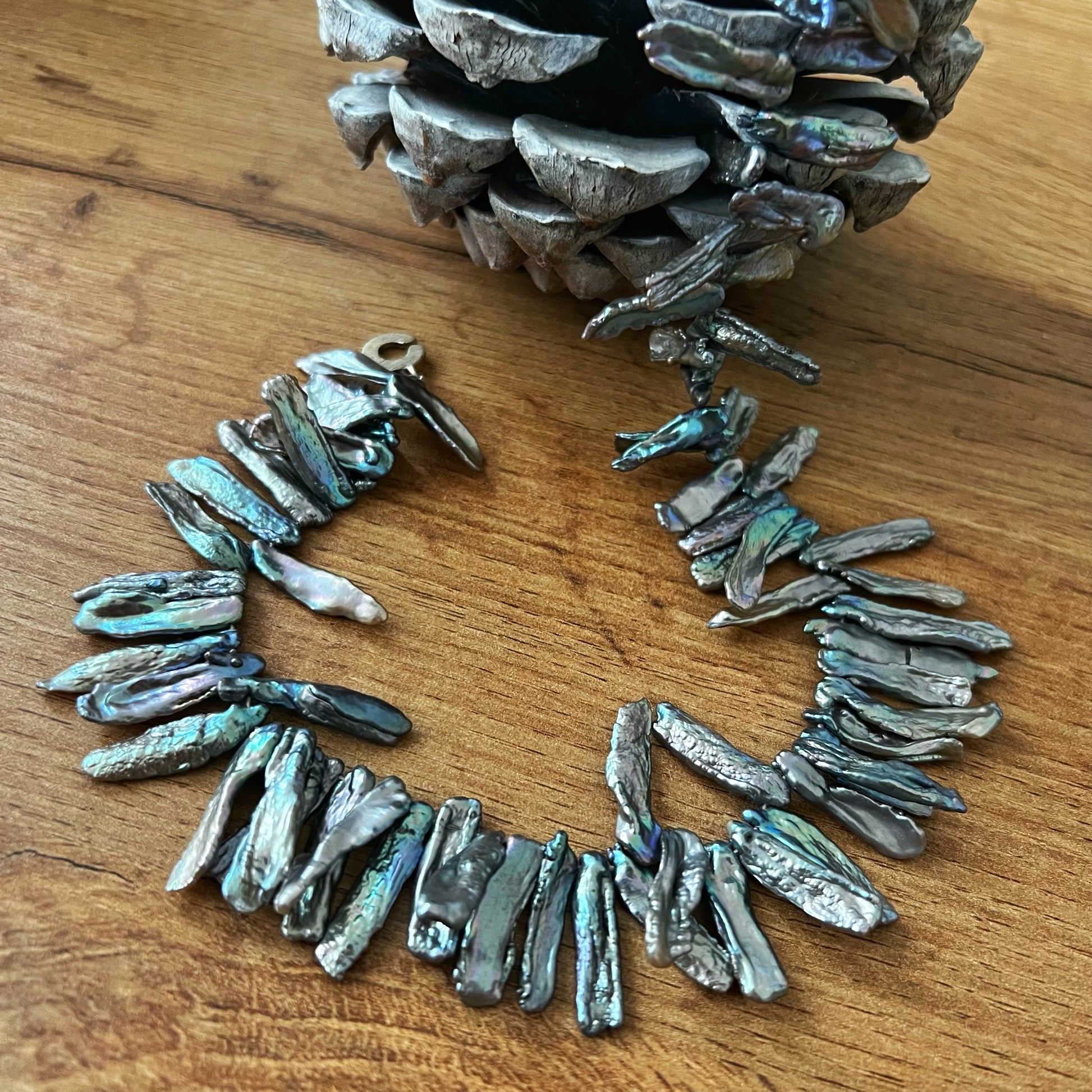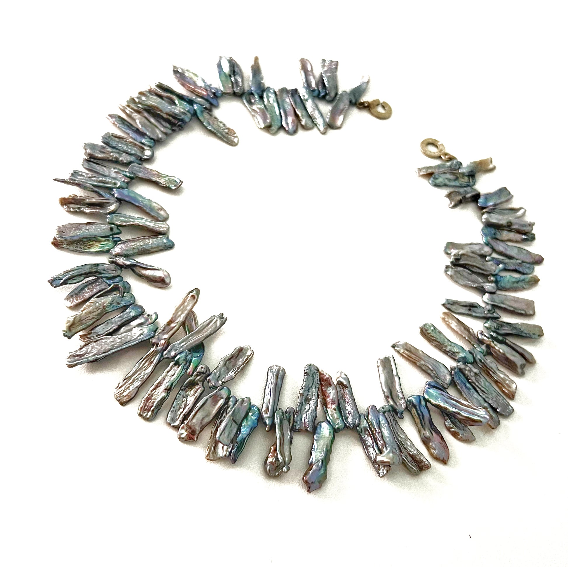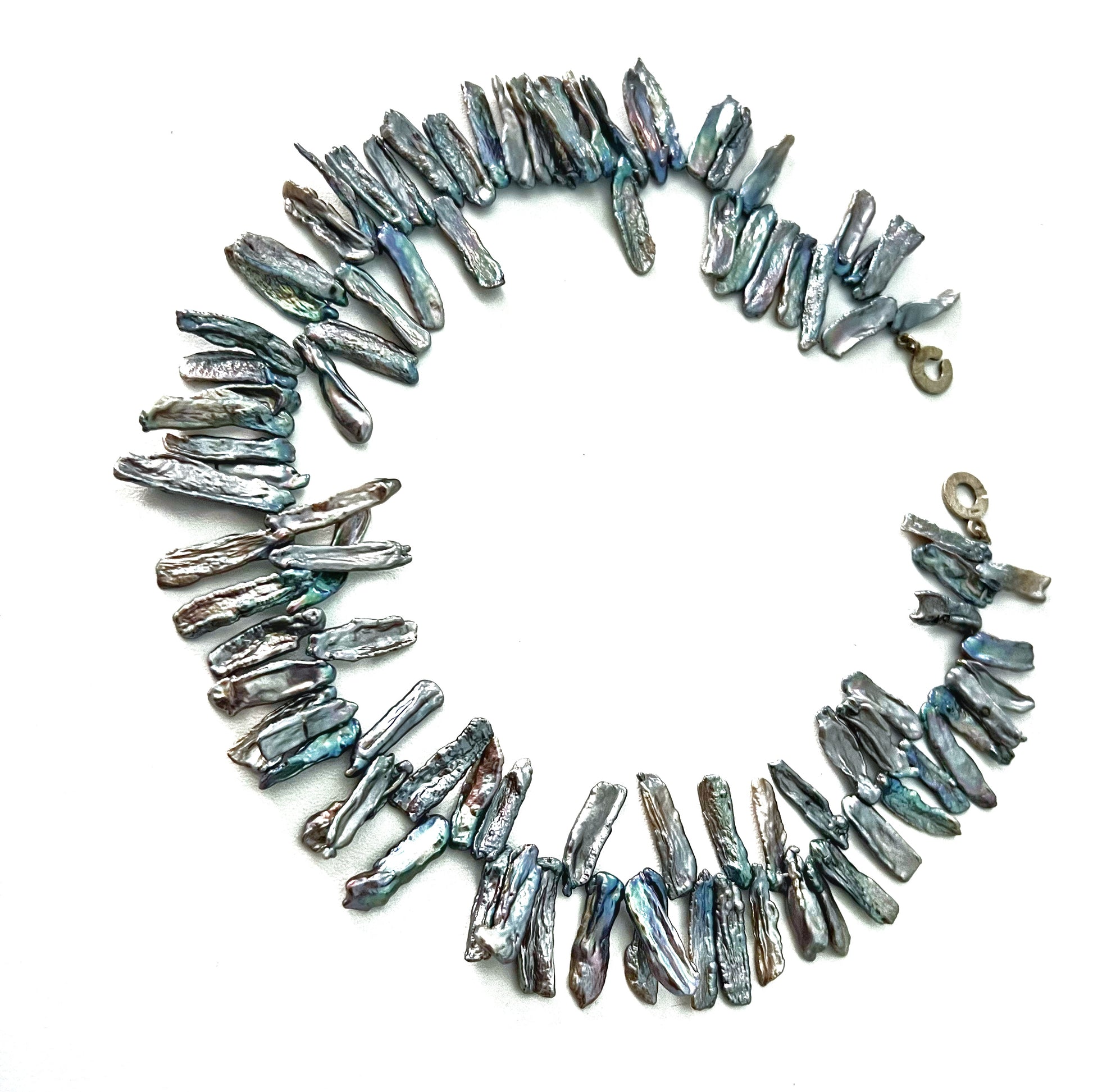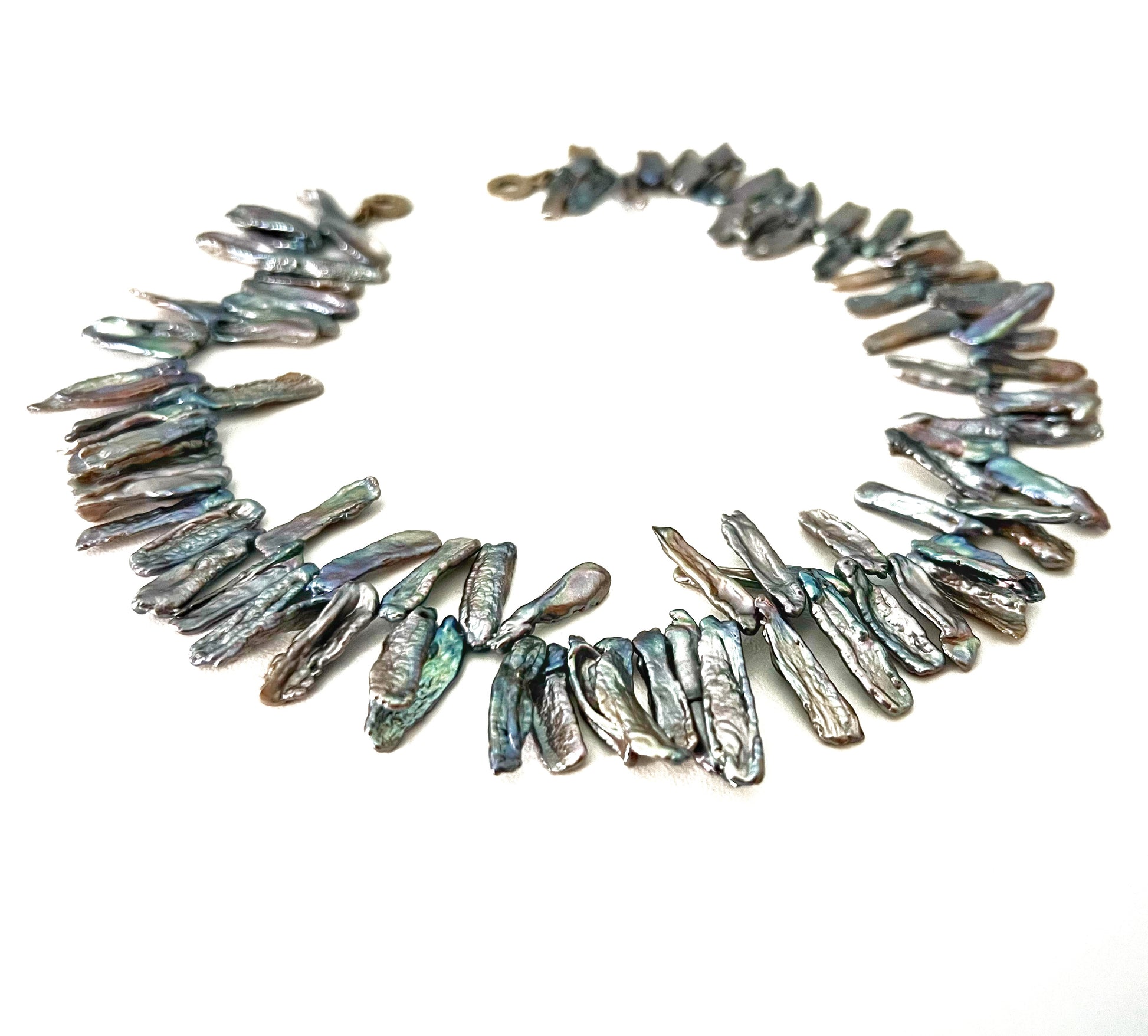 Grey black cultured pearl choker with iridescent hues in shades of blue and purple, showcasing a rich variety of reflections.