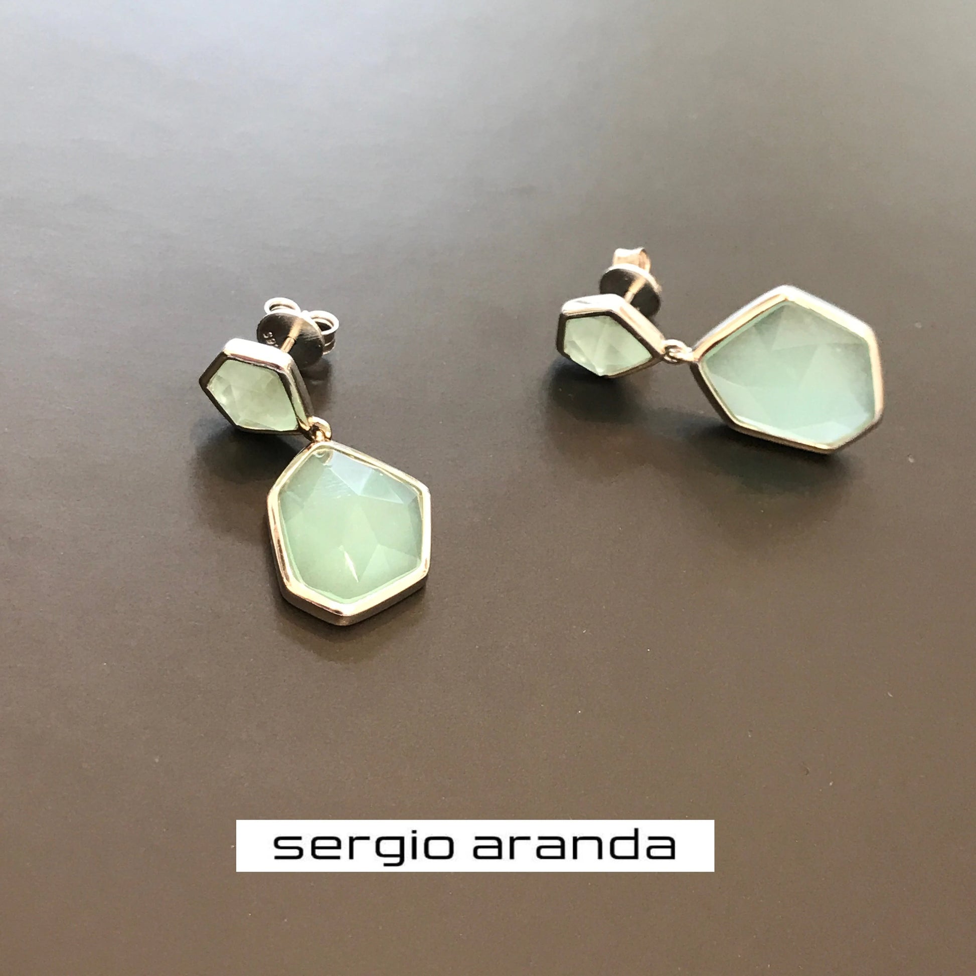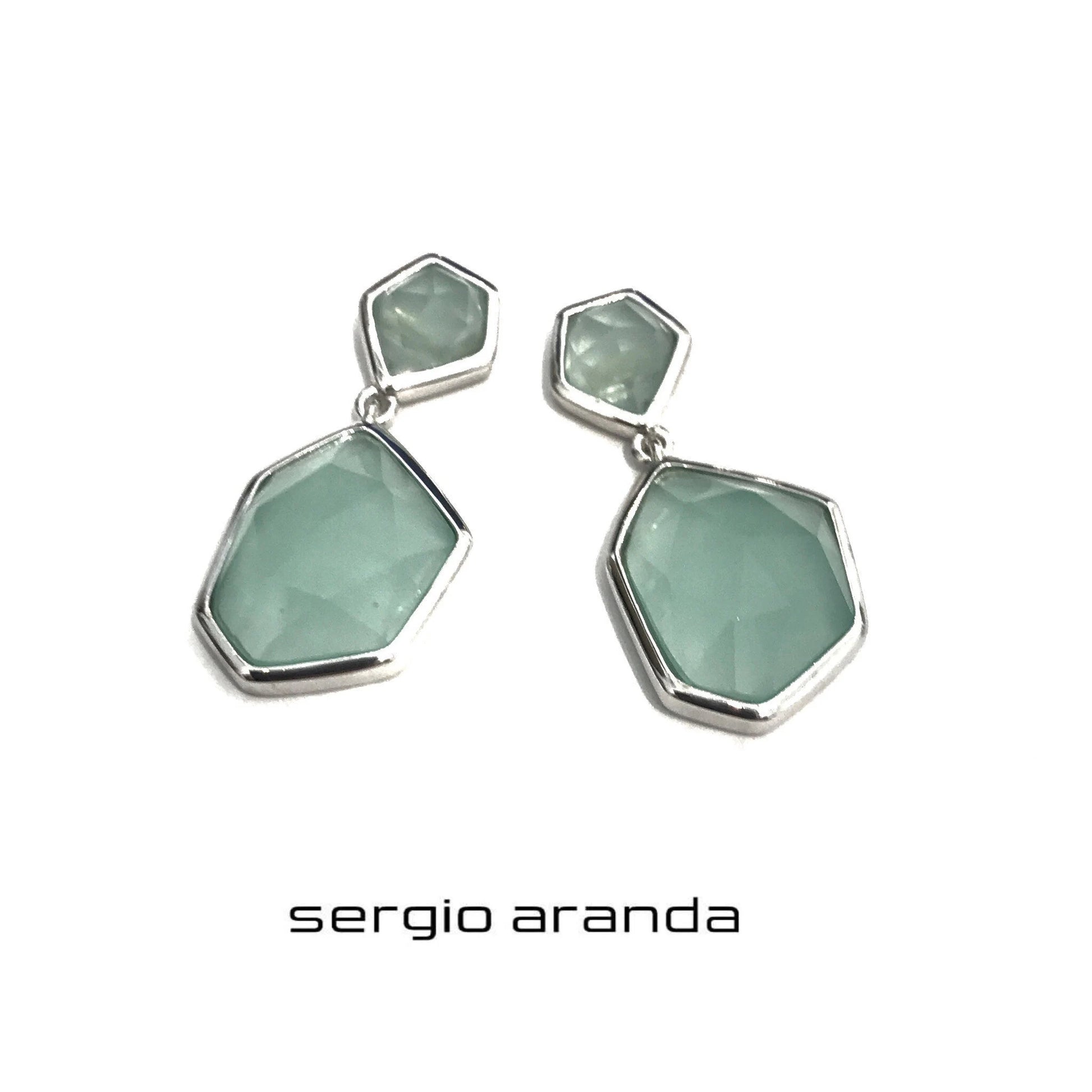 Earrings with Gemstones. Art Deco style, minimalist and geometric, featuring CHALCEDONY in soft green tones, 14 x 30mm.