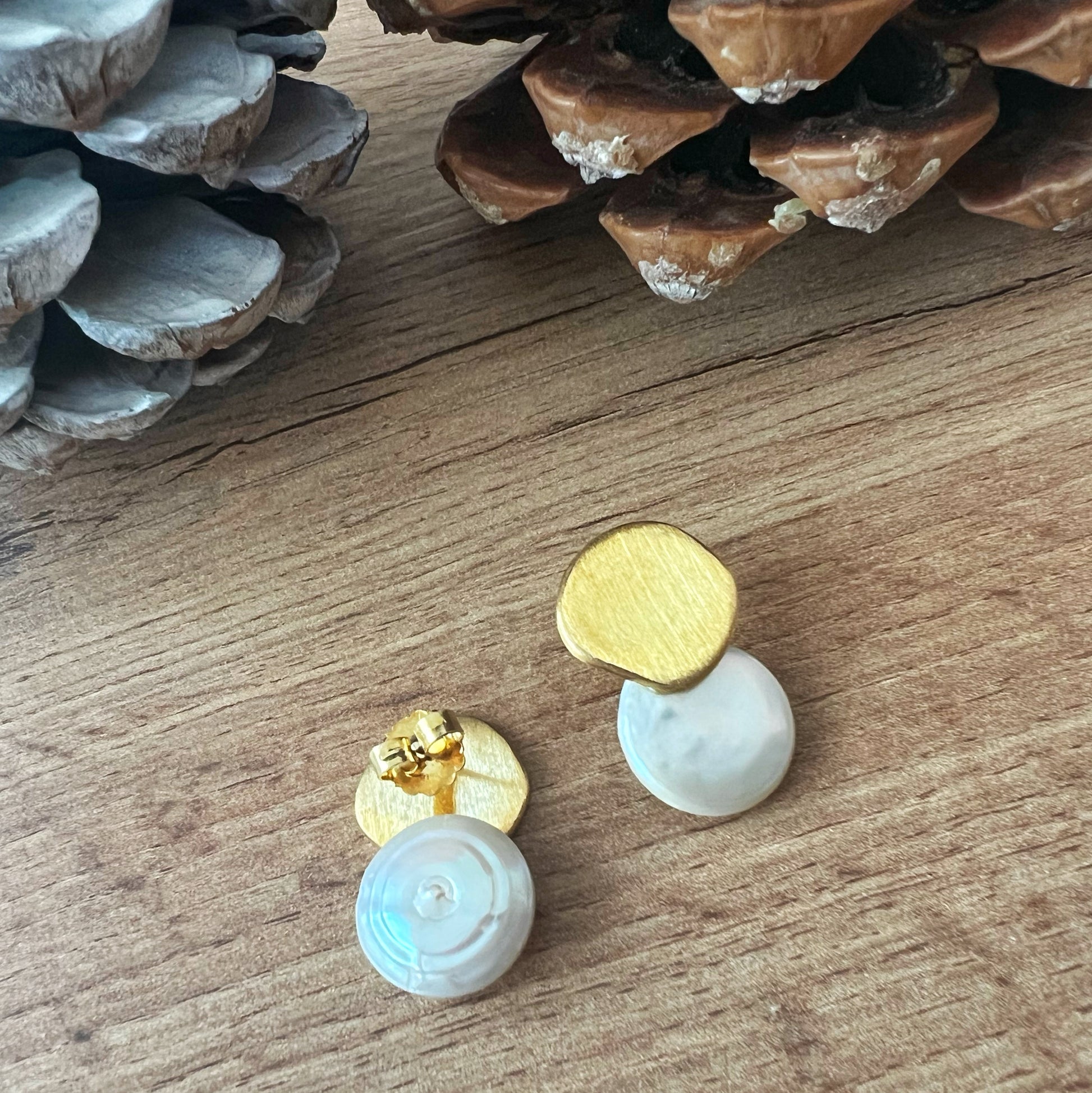 Elegant and sophisticated earrings in satin-finished sterling silver with a gold plating, enhanced with pure, radiant white Keishi coin pearls. Their design features a comfortable post and a secure push-back closure, ensuring a perfect and safe fit. These earrings are the ideal accessory for any occasion, adding a touch of distinction with their versatile size (2.7 cm long and 1.6 cm wide). A unique piece of jewelry that combines the softness of satin silver with the timeless elegance of pearls.
