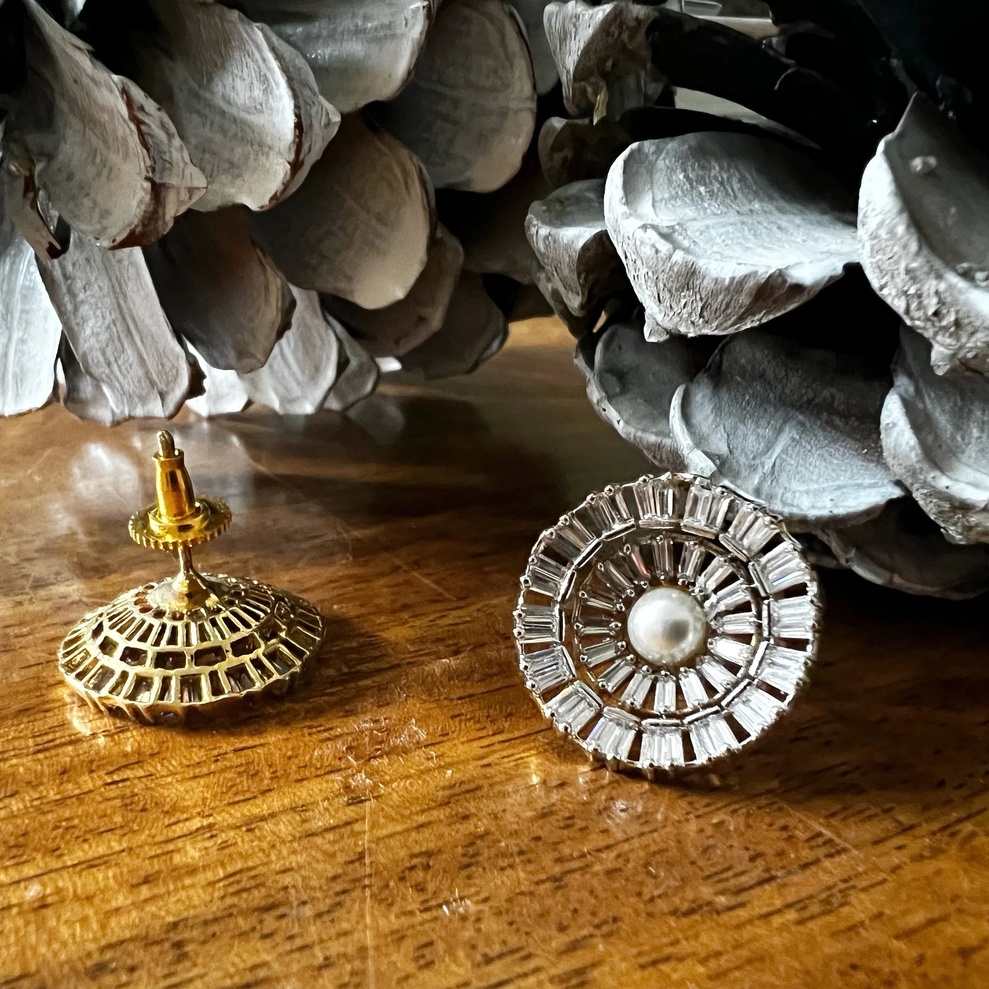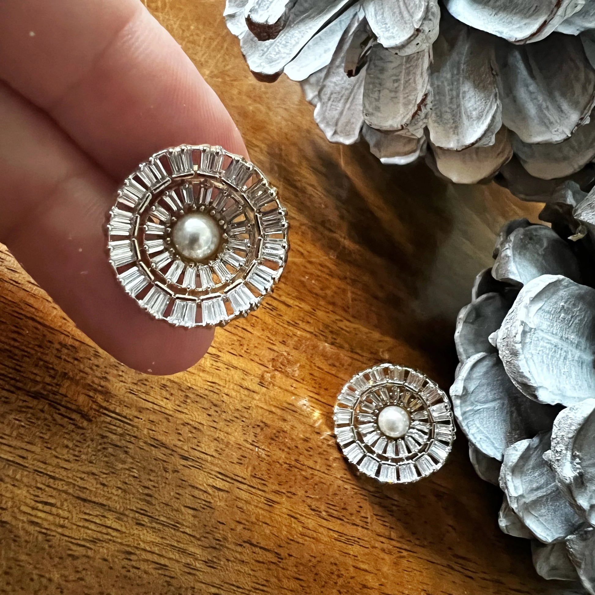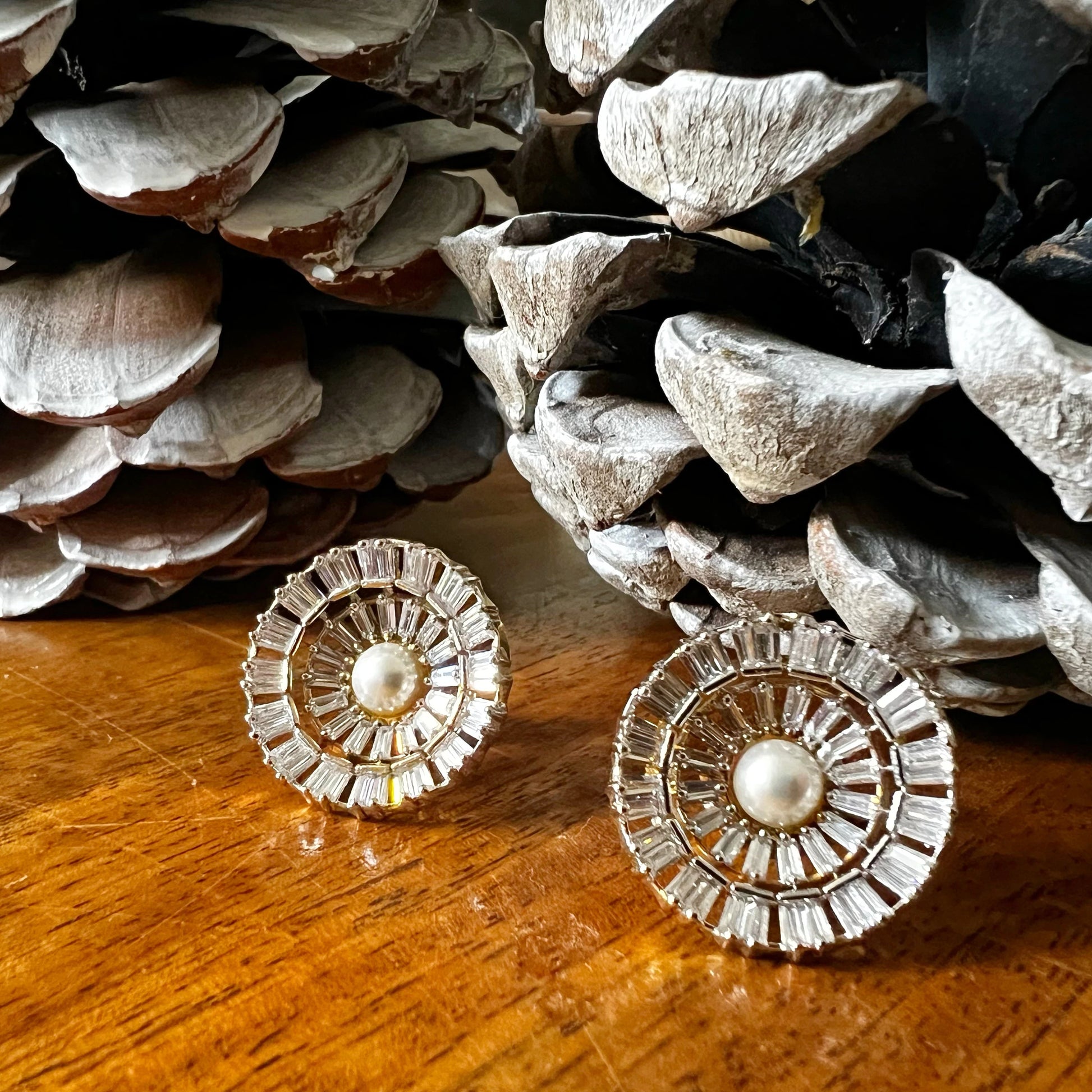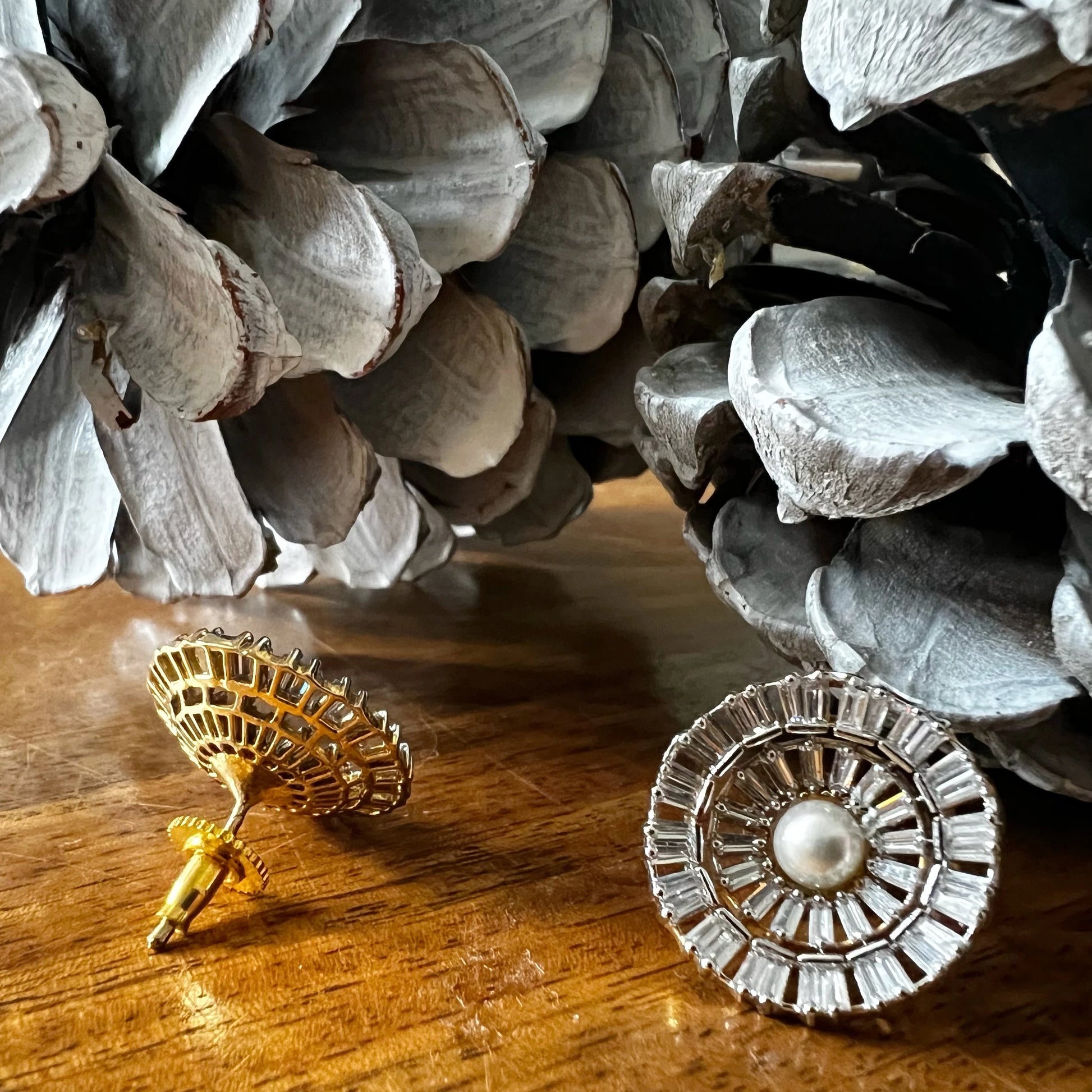 Elevate your style with our exquisite gold-plated brass earrings, adorned with semi-round pearls and dazzling zirconia stones. These 2 cm (approximately 0.8 inches) button-style earrings feature a delicate pearl at the center, adding an elegant and glamorous touch to any outfit.