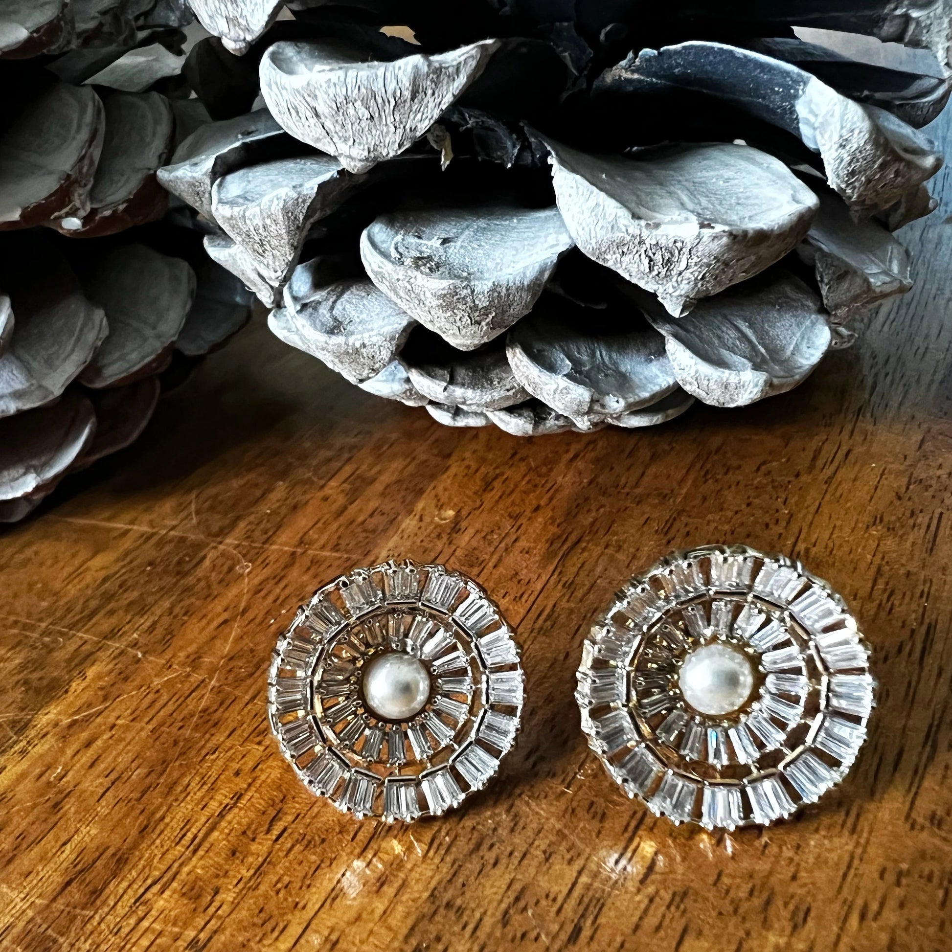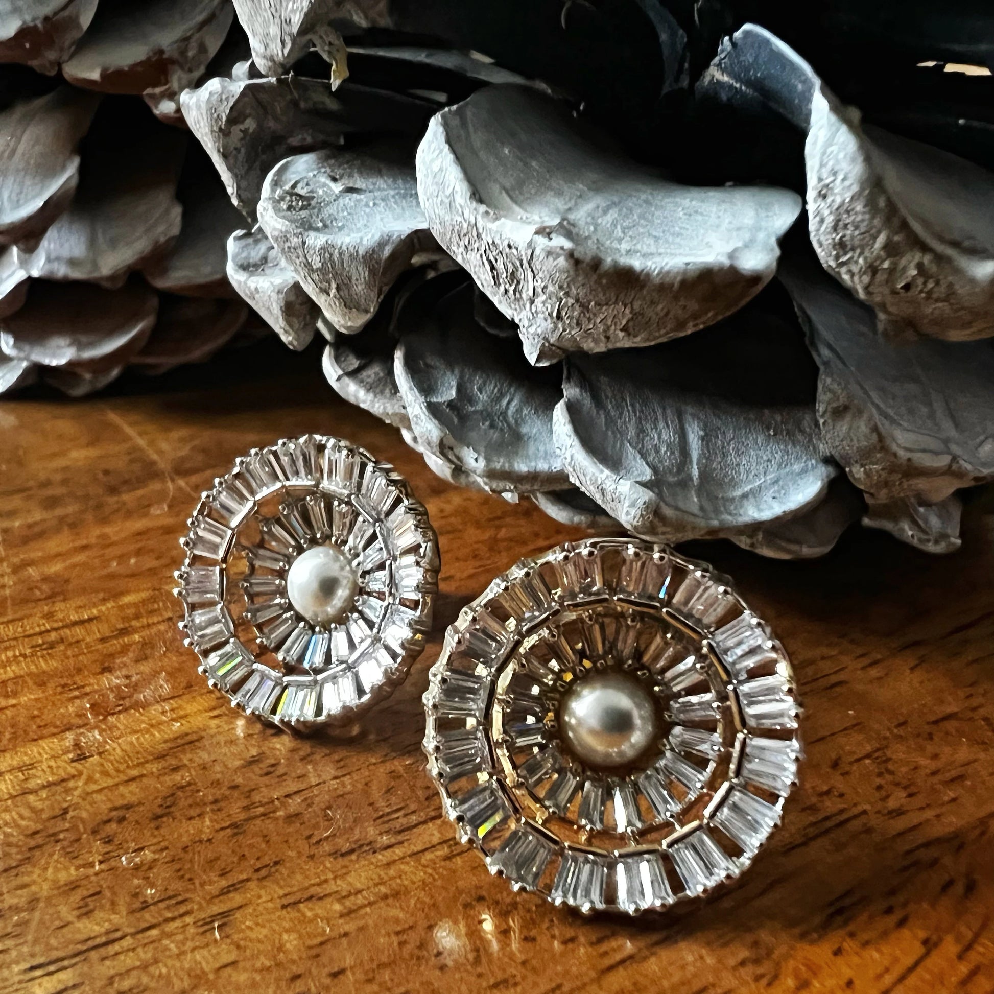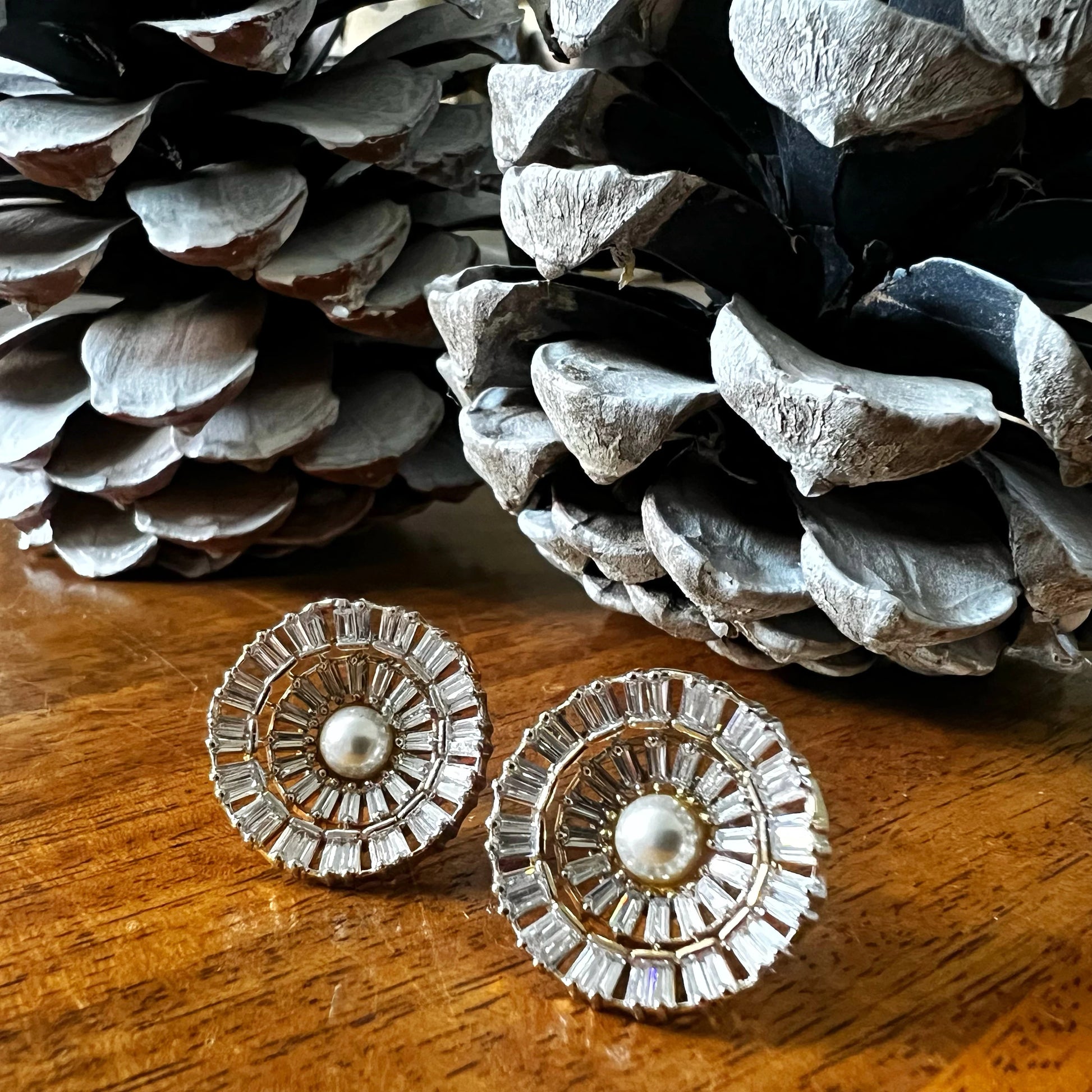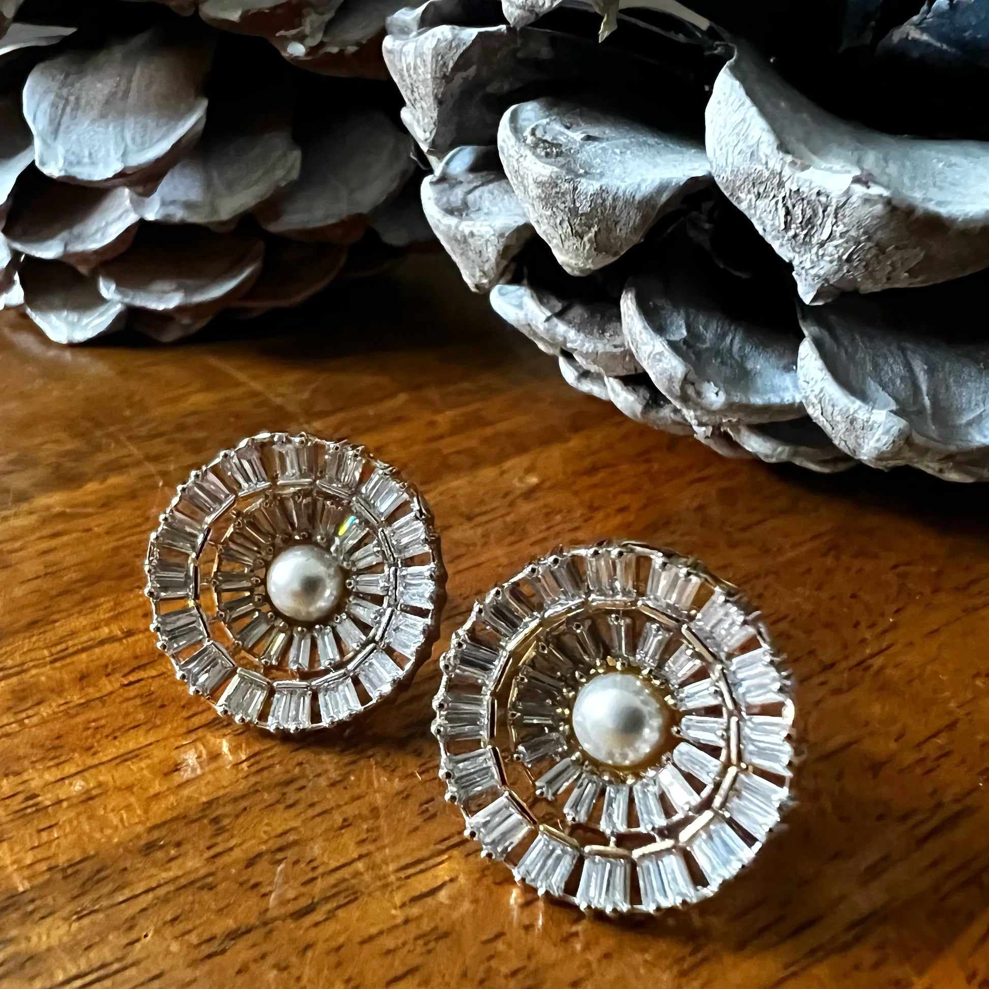 Elevate your style with our exquisite gold-plated brass earrings, adorned with semi-round pearls and dazzling zirconia stones. These 2 cm (approximately 0.8 inches) button-style earrings feature a delicate pearl at the center, adding an elegant and glamorous touch to any outfit.