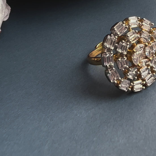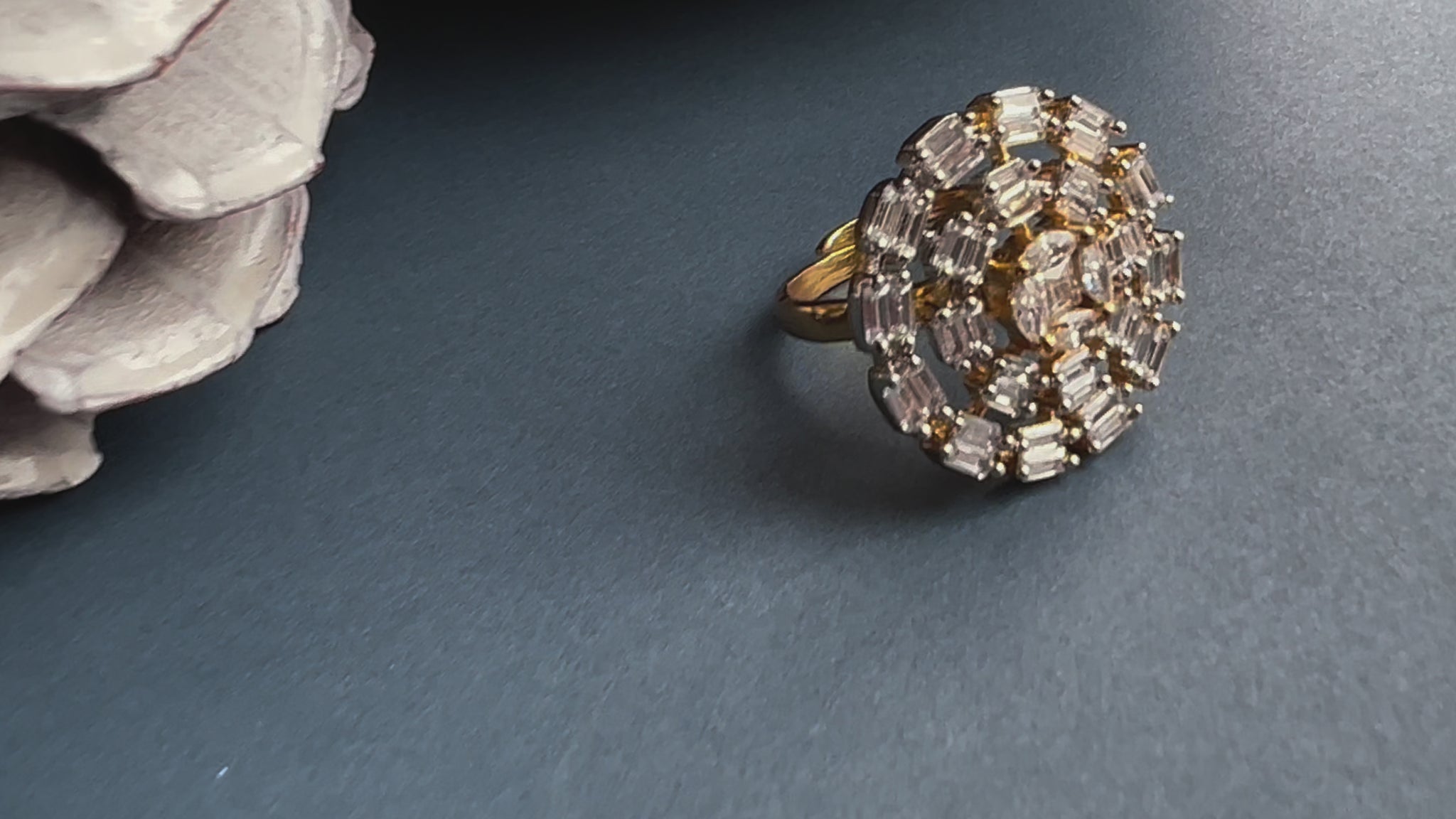 This exquisite brass gold-plated ring is a true masterpiece, designed to bring a touch of luxury to any look. The focal point of this adjustable, one-size-fits-all ring is a striking circular centerpiece, adorned with an array of brilliant zirconium stones in a captivating mix of shapes. Each gemstone sparkles with a unique radiance, creating a dazzling display that catches the light from every angle. With a comfortable 16mm diameter, this open, adjustable ring is perfect for adding a sophisticated and timeless charm to any outfit. Whether worn alone or layered, it’s a piece that effortlessly combines elegance with versatility.