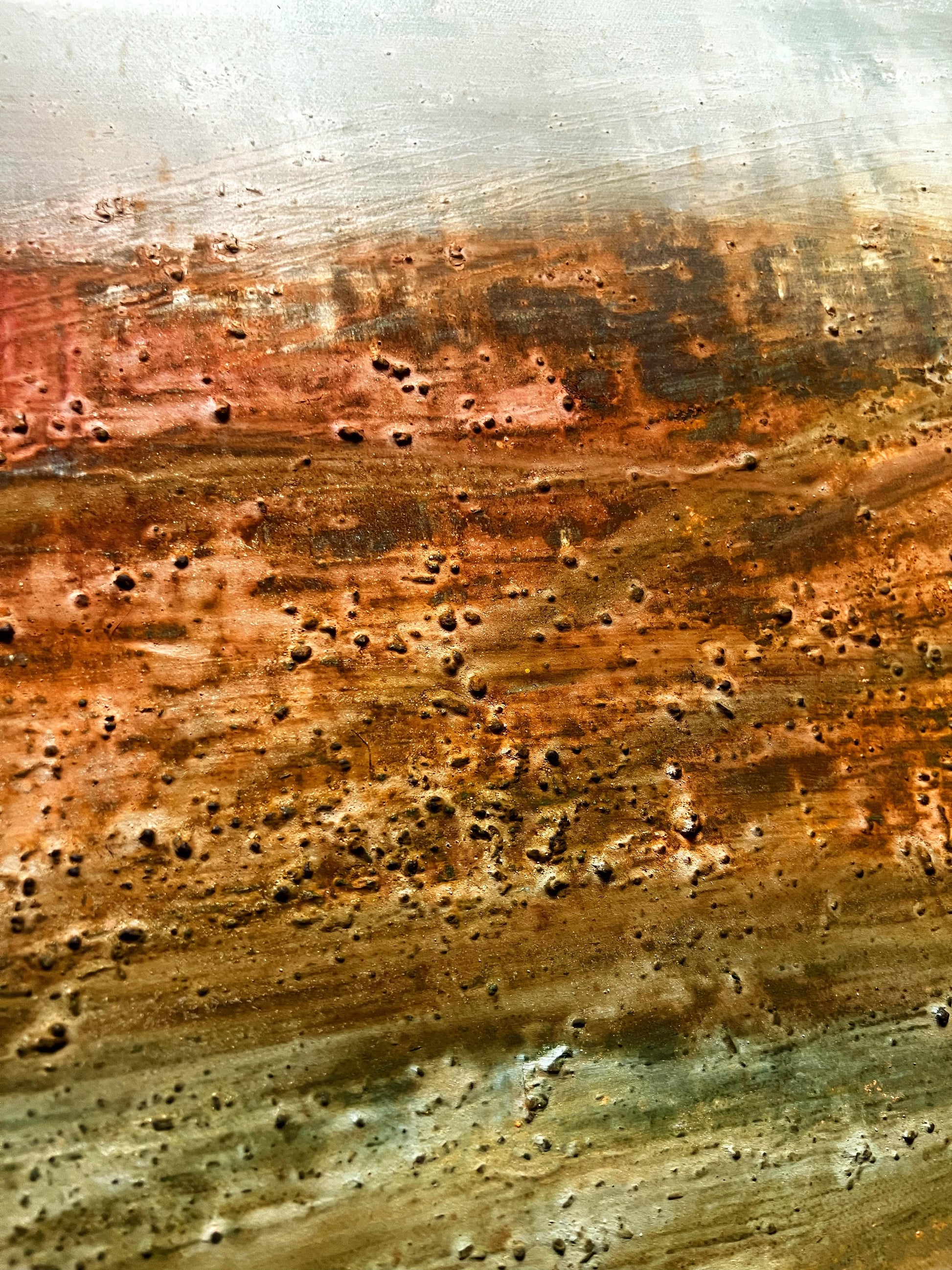 - Acrylic on canvas, mixed media, texture, rust, beauty in decay