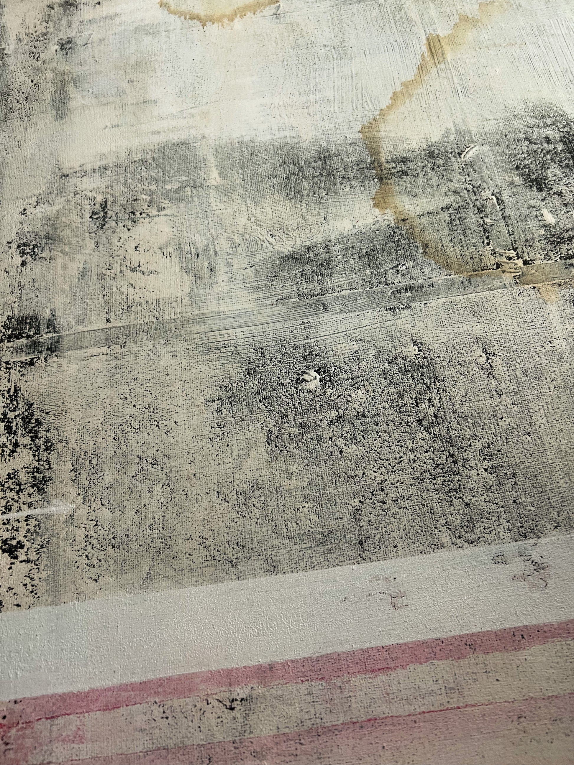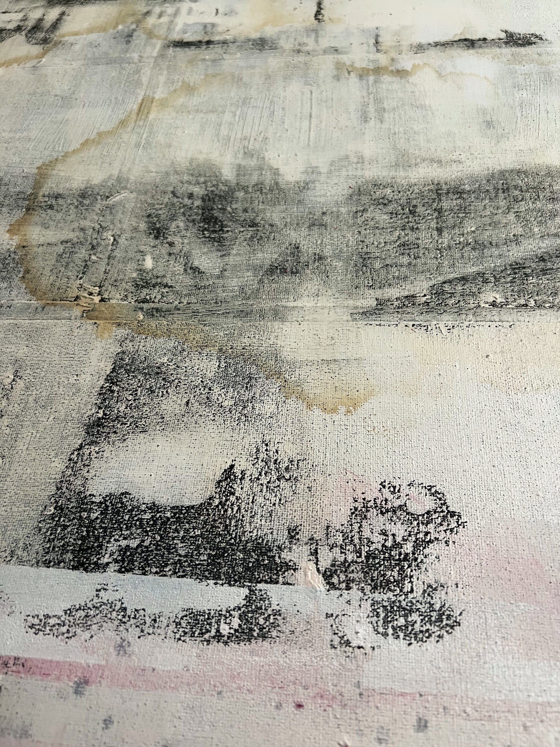 - Acrylic on canvas, mixed media, corroded by time, collage