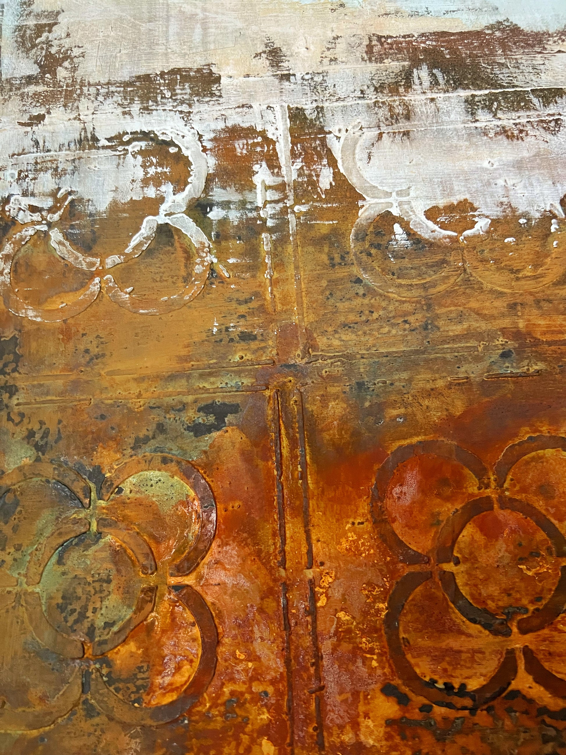 These one-of-a-kind artworks combine mixed media techniques, with textures crafted from gesso, sawdust, acrylics, and hand-blended pigments, resulting in layered surfaces that reveal the beauty of imperfection and transformation.