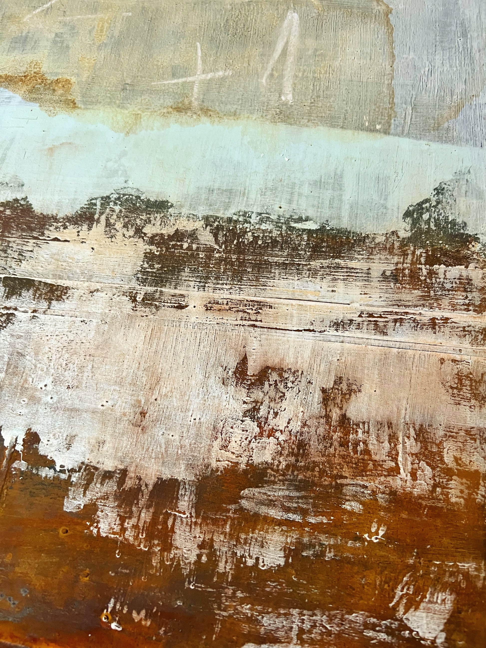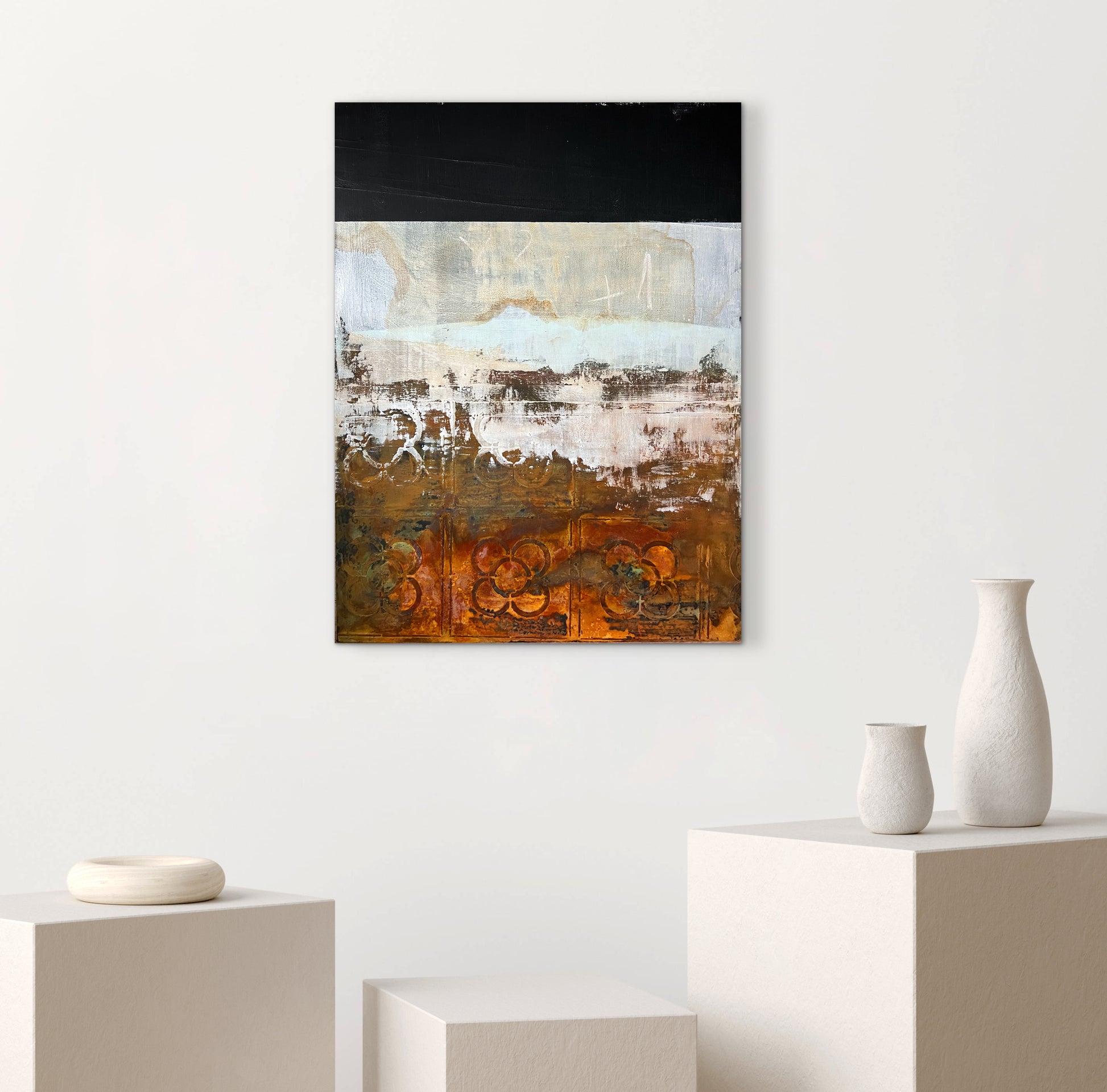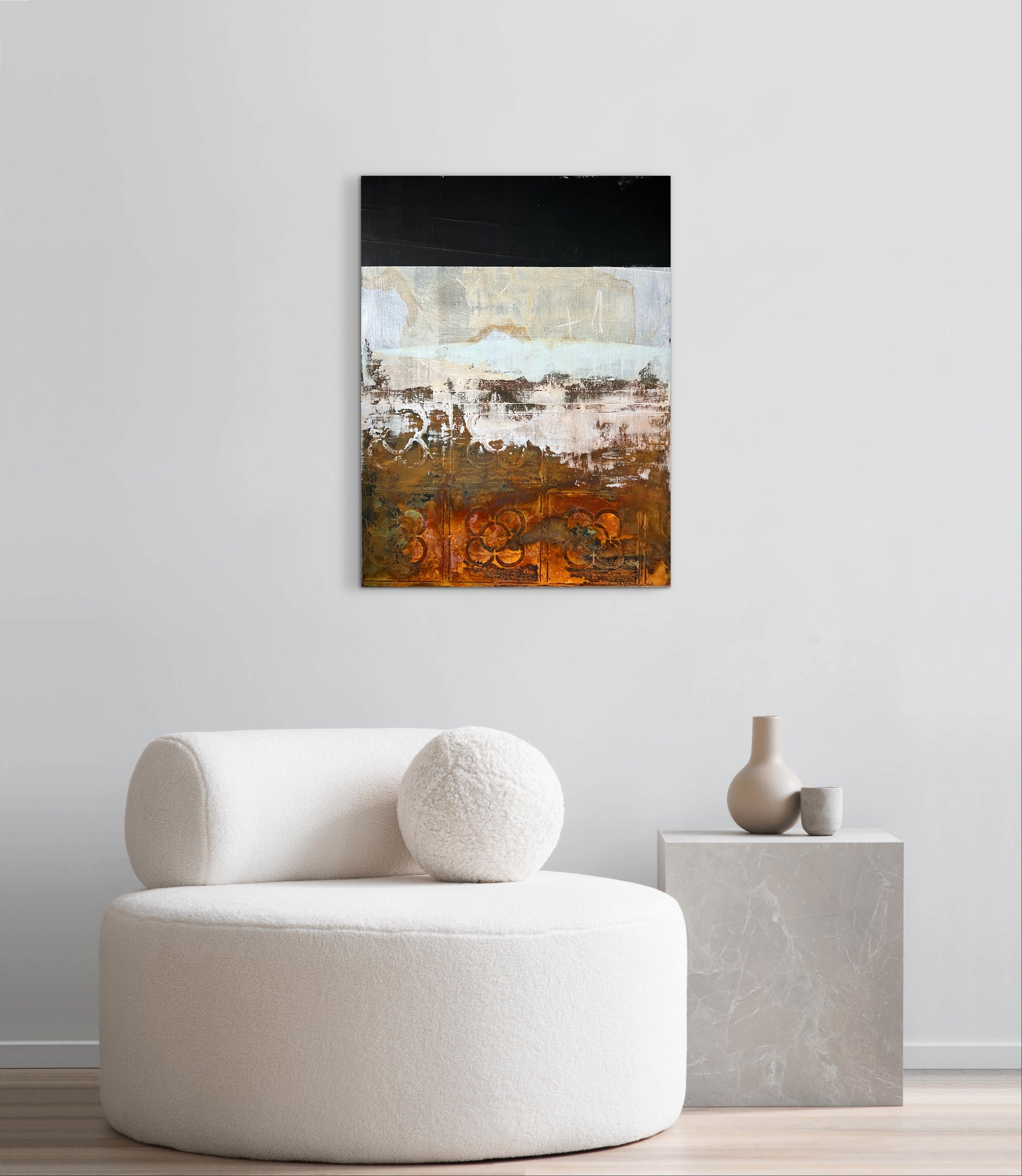 My work delves into the essence of contemporary art, expressed through minimalist canvases enriched with organic, tactile qualities. Each piece invites a journey into natural harmony, where earthy tones and subtle corrosion effects evoke a serene yet powerful connection to the natural world.