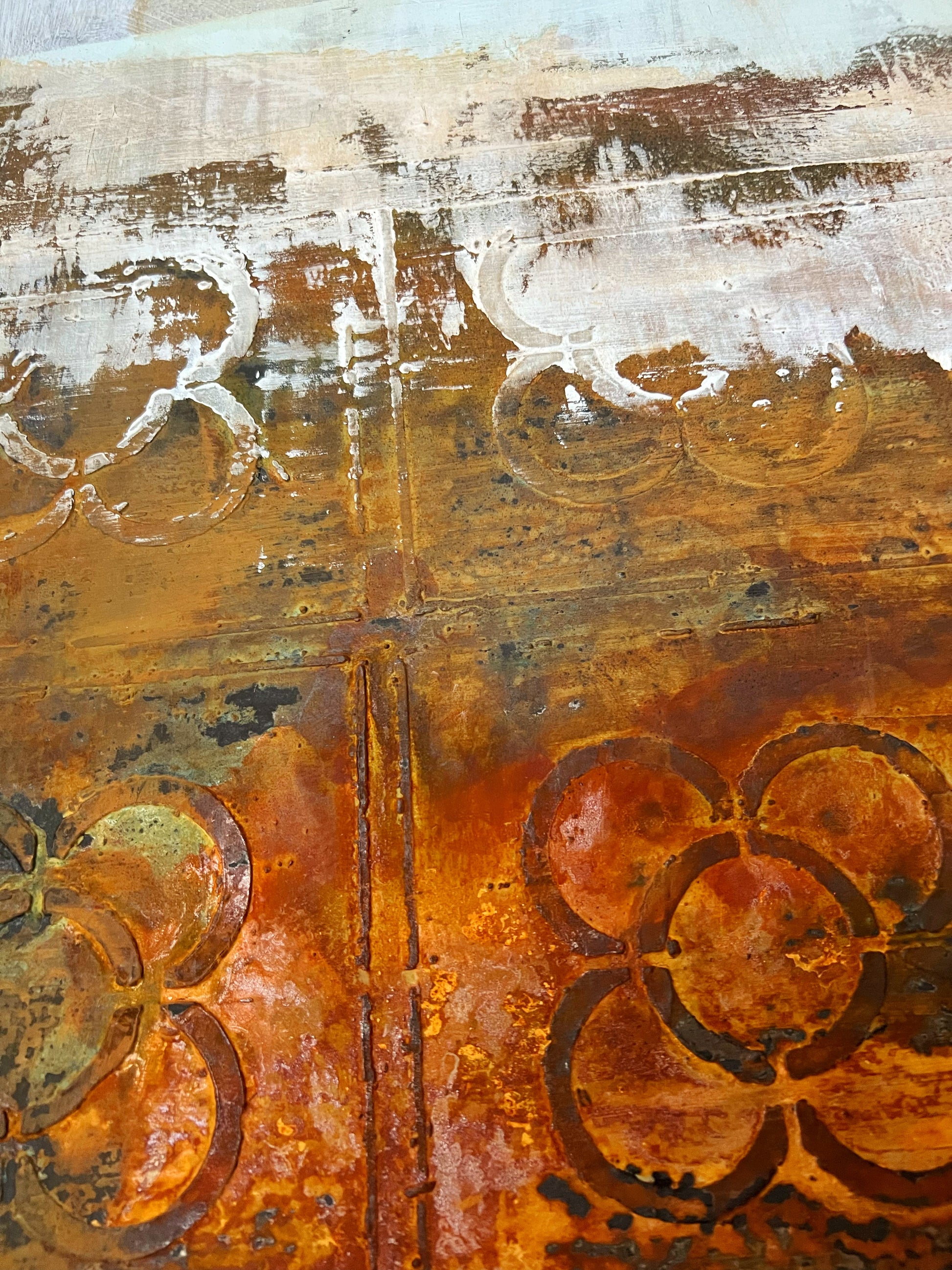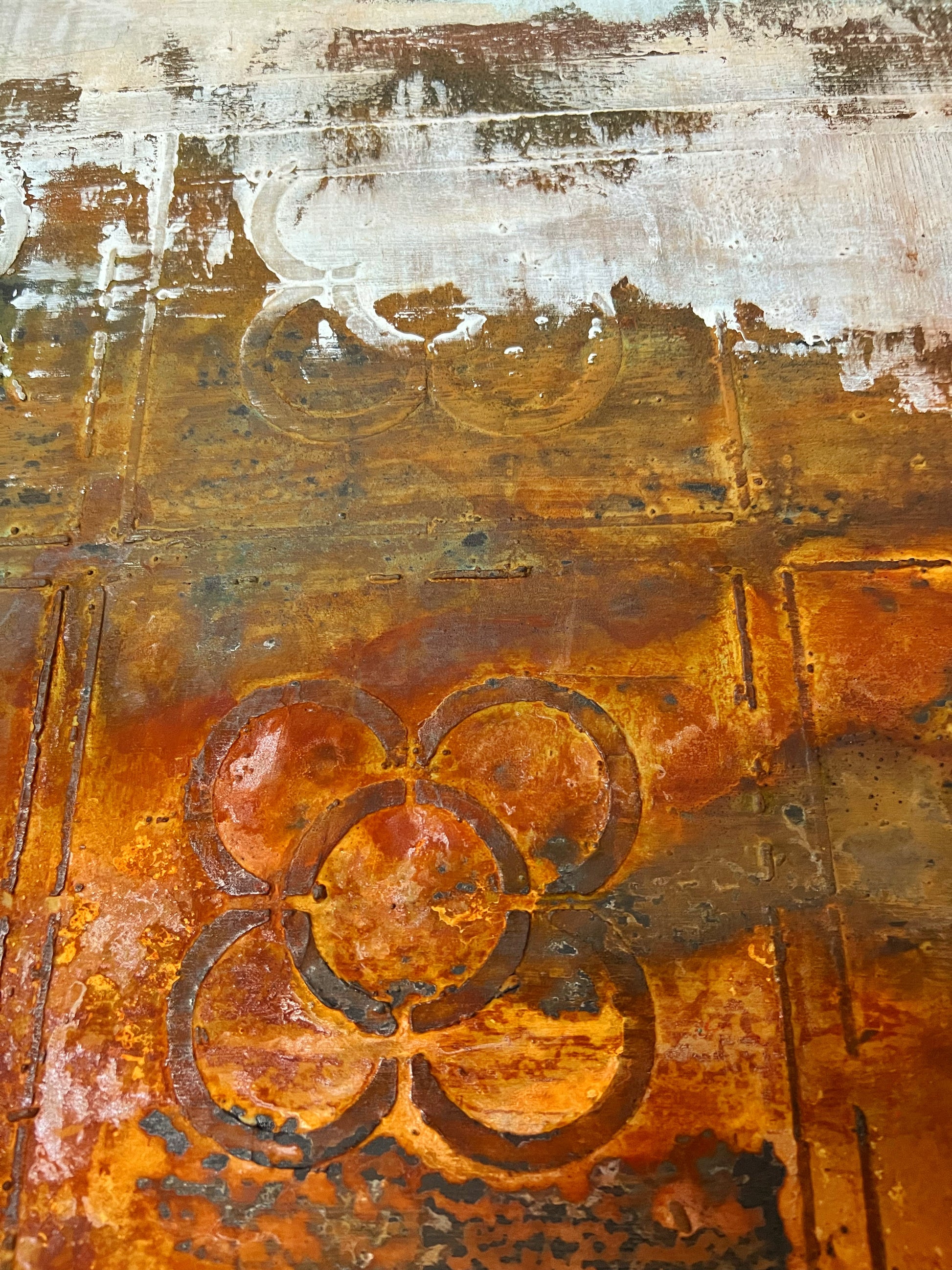 Medium: Acrylic on wood panel with mixed media elements, featuring rich textures, rust accents, and the iconic Panot pattern of Barcelona